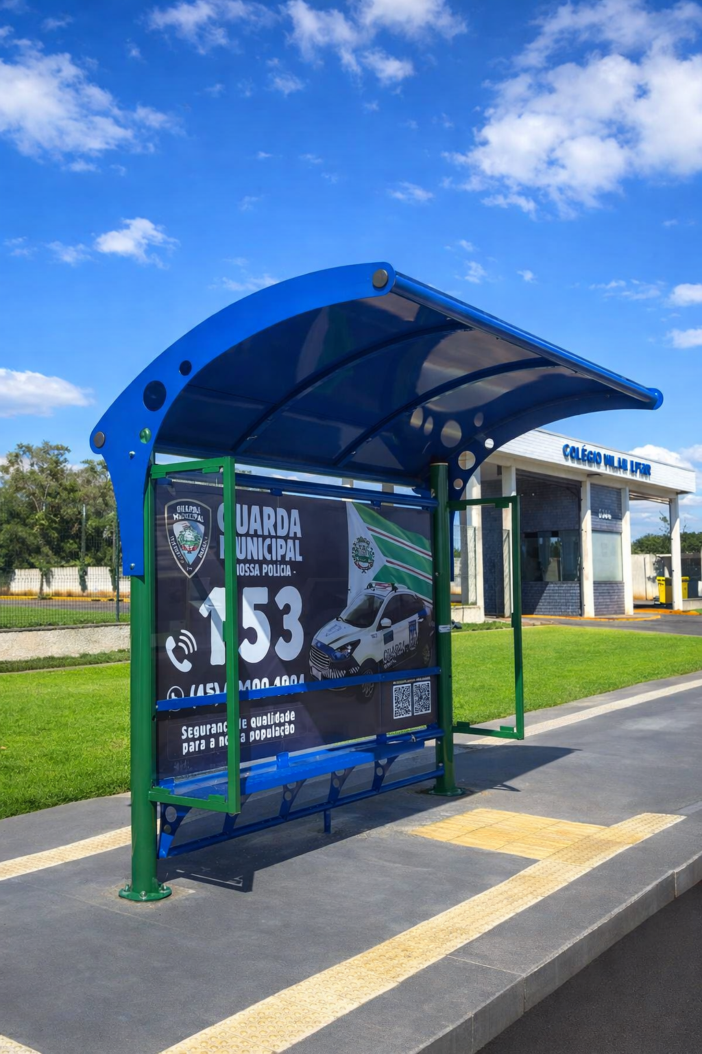 Espaço para 4 (quatro) pessoas sentadas e um cadeirante, além de espaço coberto para 8 (oito) usuários. Possui bancos e encostos ergométrico com bordas arredondadas, com iluminação noturna e quadro em vidro para adesivagem de informações das rotas. Montagem em blocos para facilitar a instalação. Identificação com etiqueta antivandalismo com informações do fabricante, mês e ano de fabricação, número de série. Fabricação nas normas da ABNT, Desenho industrial/técnico com dimensões e peso. Manual de montagem e instalação dos produtos. Montagem em 4 blocos para facilitar a instalação. Placa de alumínio com marca e demais informação do fabricante.