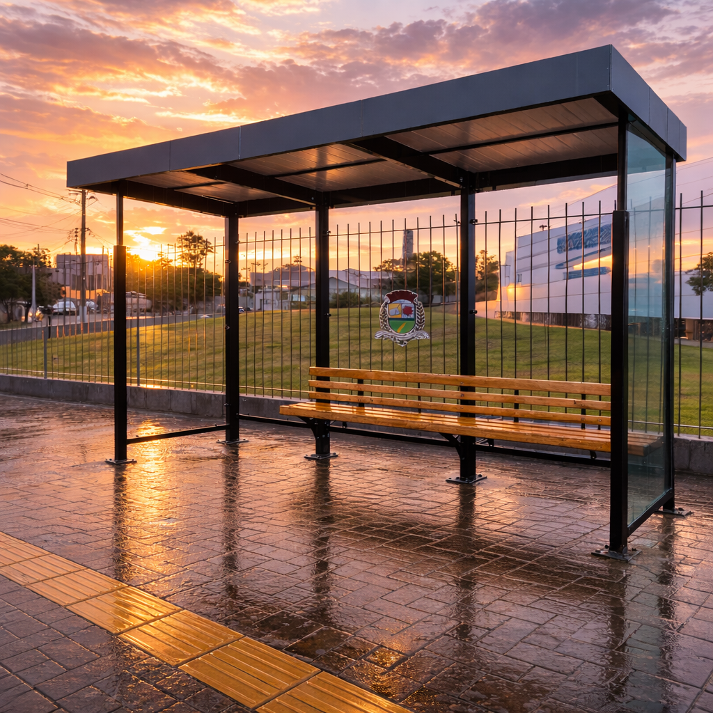 Espaço para 6 (seis) pessoas sentadas e um cadeirante, além de espaço coberto para 12 (Doze) usuários. Possui bancos, iluminação noturna e quadro em vidro para adesivagem de informações das rotas. Montagem em blocos para facilitar a instalação. Identificação com etiqueta antivandalismo com informações do fabricante, mês e ano de fabricação, número de série. Fabricação nas normas da ABNT, Desenho industrial/técnico com dimensões e peso. Manual de montagem e instalação dos produtos. Montagem em 4 blocos para facilitar a instalação.