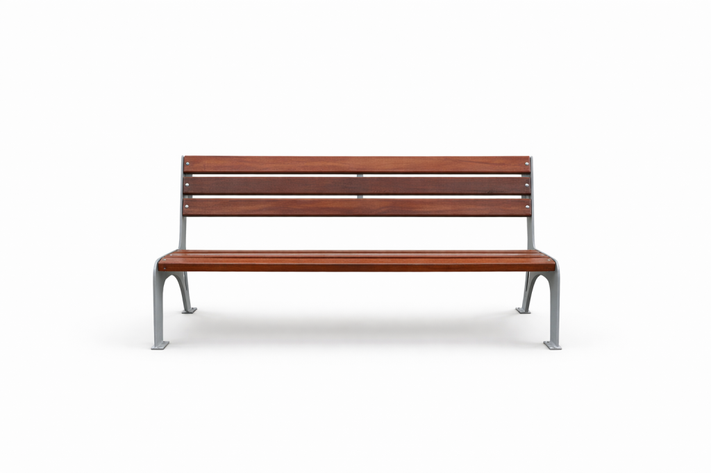 Banco com Encosto fabricado em aço carbono, estrutura principal com chapa de aco 2 mm cortado em cnc. E secundária com madeira de lei itauba, assento com 3 tabuas de aproximadamente 1500x120x20mm e encosto com 3 tabuas de aproximadamente 1500x120x20mm. Processo de Soldagem Mig e Pintura a pó eletrostática precedida de banhos químicos. Assento e encosto para 3 pessoas sentadas. Seu assento e encosto tem formato ergométrico com bordas arredondadas, sem quinas, possibilitando a acomodação de pessoas de maneira sentada confortavelmente. Placa de alumínio com marca e demais informação do fabricante. Dimensões aproximadas para instalação: 1300x1500x400 mm (AlturaxLarguraxComprimento), Peso: 12 kg.